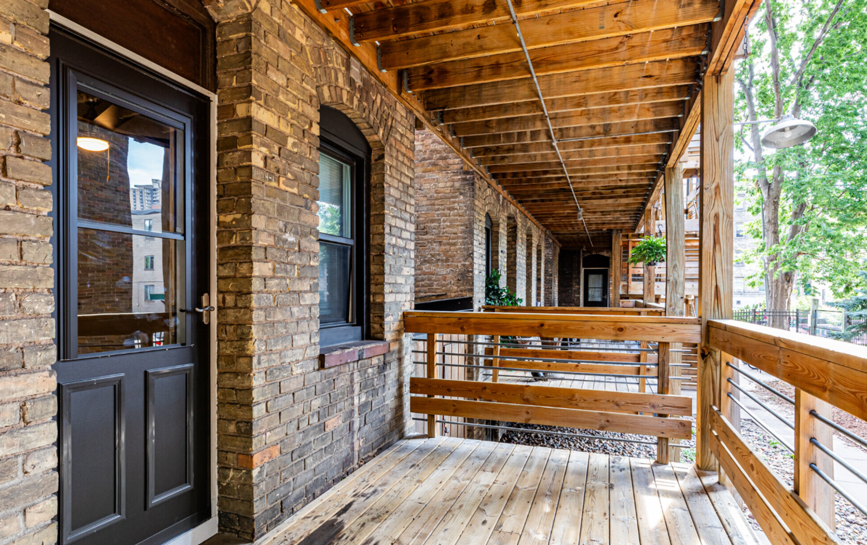 The 2 Bedroom – 1400 Spruce floor plan features a bright, open layout designed for comfort and flexibility, with a space that’s easy to personalize. The first bedroom is conveniently located just off the living area, while a long hallway leads to the full bathroom and a full kitchen with ample cabinet space and a dedicated dining area or work-from-home setup. The second bedroom is set toward the back of the unit for added privacy. A standout feature of this layout is the rear entrance, offering direct access to the community courtyard and a private deck area—creating a great outdoor space to enjoy.